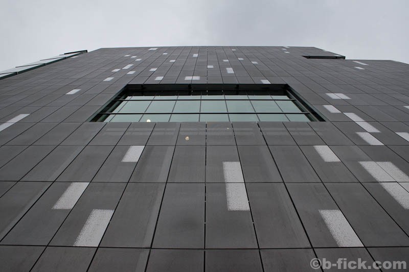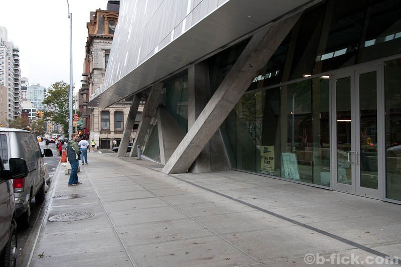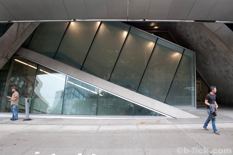 At street level, the academic building is devoid of any public interface – a small guarded lobby is as far as we were allowed. On the outside, there is an intricate relationship between pedestrians and the building along 3rd Avenue as one can walk around the obliquely angled columns, underneath the perforated skin and even on top of a few formal elements. The scale isn’t uncomfortable, but the materials are fairly harsh and lack human scale. On the back and sides, however, pedestrians are “greeted” with blank concrete walls and an unfinished tail of the perforated metal skin.