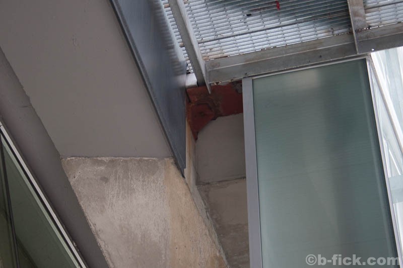 Architecture like this can be a challenge for even the most skilled designers and there are multiple, very visible unresolved areas. The most noticeable ones can be found at street level in the space underneath and behind the panelized facade. These mistakes range from rusting structural components left exposed, to incomplete storefront assemblies. After seeing a few of these types of projects, though, mistakes become expected.
