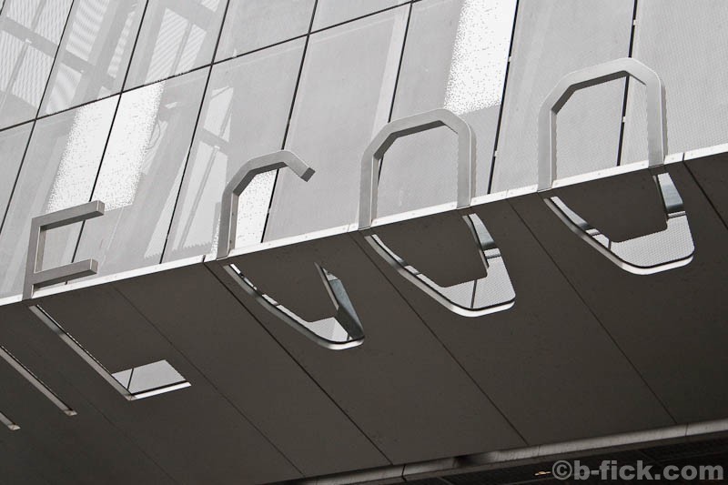 The structure was designed by Morphosis, a firm out of Los Angeles. Known recently for their public and academic work, they specialize in ultra-modern designs featuring folding planes, metal skins and complex spaces. This building continues that theme with a layered skin of glass and perforated metal panels. Finished cast-in-place concrete serves to support the structure and also break up the metal skin on the front facade.