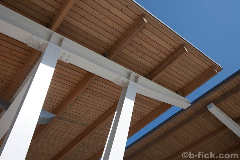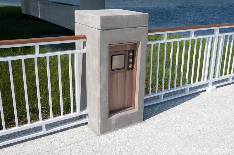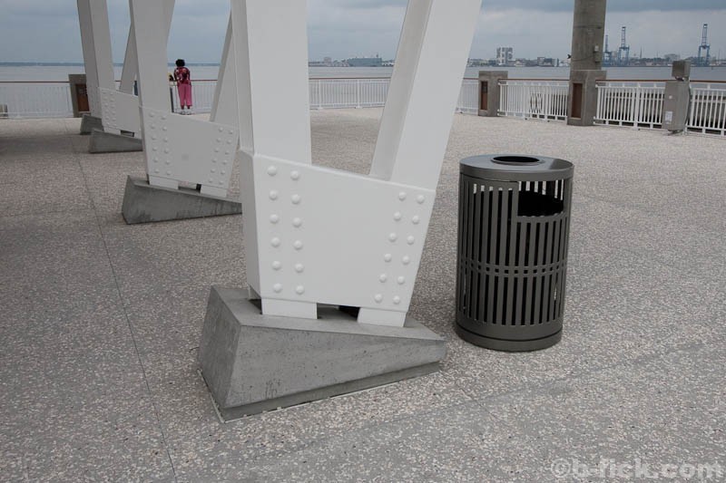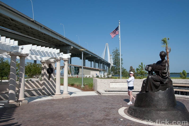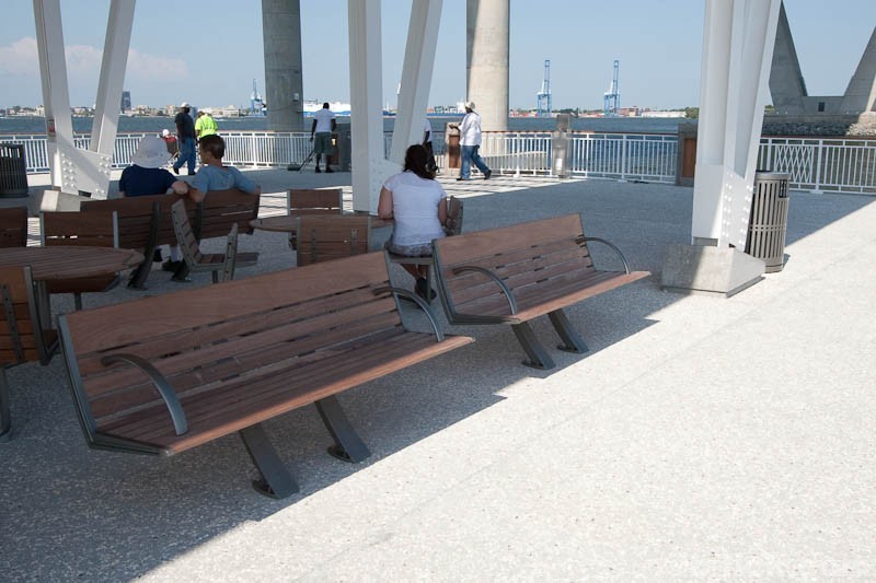 From the perspective of design, the park feels clean and modern. Primary materials, simple connections and clean lines dominate views. Structures are designed with a clear hierarchy of materials and connections are expressed. This can be seen best on the pier where concrete forms the structural backbone of the then steel and wood canopies. Lighting on the pier is taken care of through traditional posts, canopy uplighting and an over-designed recessed wooden light assembly located in each concrete railing post. Seating is handled through an extensive collection of metal and wood benches, tables and swings. The landscape of the park space feels urban thanks to the array of sculpted and curved walkways, open grass areas, numerous planting beds, groups of flowers and water features. A curved trellis and fountain that surround a bronze sculpture of a woman holding a folded flag make up a solemn war memorial. The park compliments the Ravenel Bridge in every sense of the word and is a comfortable place for people to be while on the harbor.