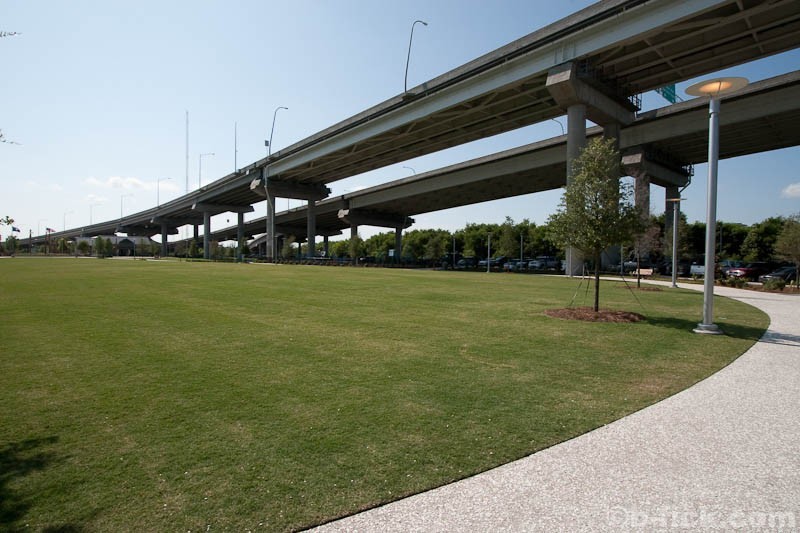 Capitalizing on the popularity of the Ravenel Bridge’s pedestrian walkway and Patriots Point, the park reclaims a sizable chunk of land that was formerly the location of the previous Cooper River Bridges, as well as a staging area for the construction of the new bridge. Because it is not visible from any major road, ample signage directs people to the park. Parking is relegated to the space underneath the bridge approach span, thereby preserving as much land as possible for park functions.
