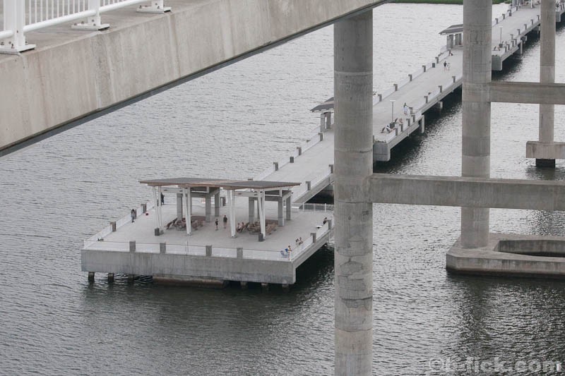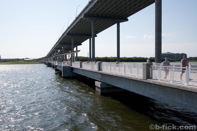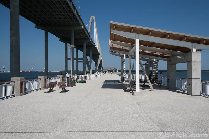 The pier, measuring in at 1250 feet in length, is the longest in the area and seems to provide ample space for fishing, walking and sitting. It is constructed of concrete and features four covered seating pavilions. Although nothing informs visitors of this, the pier is actually built on the partially demolished support columns from the old Cooper River Bridge – a fitting homage given the enormous impact the bridge had on development of Mt. Pleasant over the past 50 years. A walk to the end of the pier provides tremendous views of the new bridge towering above, the harbor stretching out in all directions, Patriots Point to the southeast and all of the ship traffic that passes daily.